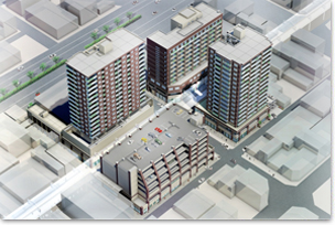 本事業は、長崎県佐世保市の中心部において、商店街を軸に4つの街区で同時に施行される市街地再開発事業です。商業施設と公益施設(中央公民館等)を核として、分譲住宅・高齢者施設・医療施設や時間貸し駐車場など、コンパクトシティに求められる各種都市機能を配置することにより、中心市街地の活性化に寄与する事業です。